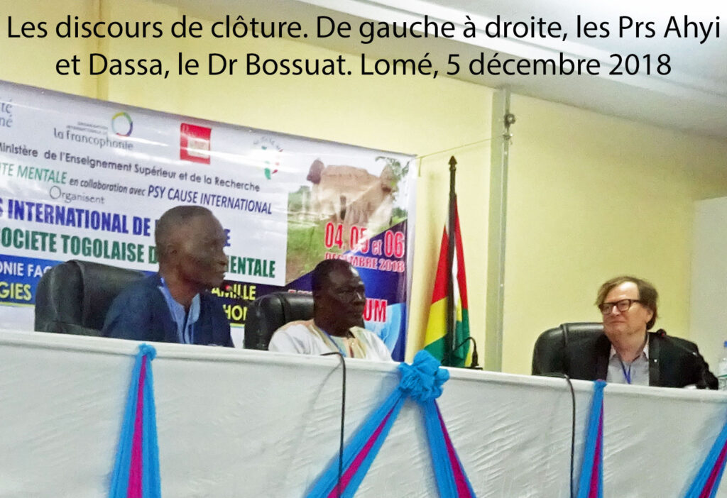Le Dr Bossuat remercie le Pr Dassa et le Pr Ahyi pour leurs propos. Il remercie et félicite le Dr Salifou et le comité togolais d’organisation, dont la dynamique équipe de Psy Cause Togo, pour la parfaite réussite du congrès. Il rebondit ensuite sur les paroles du Pr Ahyi, en précisant que ce dernier, au Bénin, fut le « premier des pionniers ». Bien plus, pour la revue Psy Cause, il fut un « parrain ». Car il fut à l’origine de la vocation africaine de Psy Cause. Le congrès de Parakou en 2008, notre IVème congrès international, fut un moment charnière auquel prit part son successeur, le regretté Pr Tognidé qui transforma l’essai auprès du CAMES. Le Dr Bossuat s’adresse, enfin, à tous les congressistes, en tant que directeur de revue : les communicants sont conviés à réaliser un travail d’écriture pour transformer leurs présentations orales en articles.