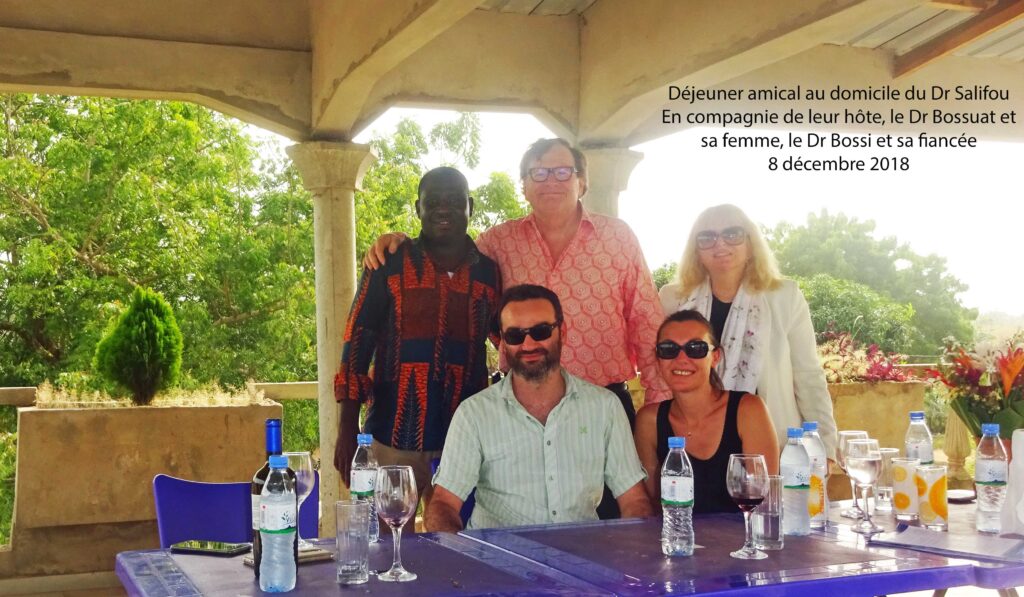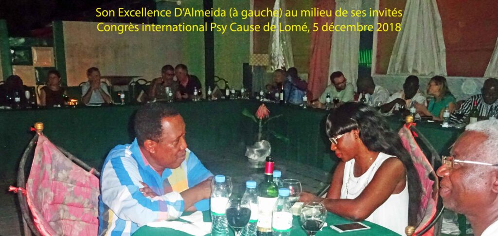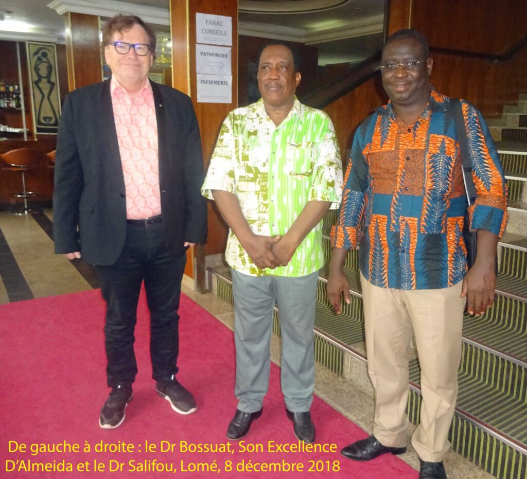 Le 8 décembre, Son Excellence D’Almeida fait le déplacement pour rencontrer le Dr Bossuat dans son hôtel. Ceci afin de saluer le Président de Psy Cause International avant son retour en France le lendemain, et d’avoir un temps d’échange. Il a évoqué certains de ses projets et exprimé le souhait de développements futurs avec Psy Cause au Togo. Après la photo (ci contre) réalisée à l’hôtel en présence du Dr Salifou, le Dr Bossuat et sa femme sont invités à un déjeuner amical au domicile du Président de Psy Cause Togo.