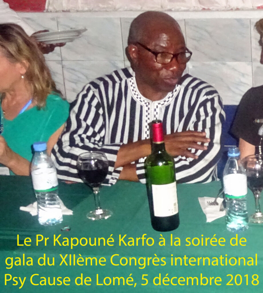 Nous achevons ce récit de la soirée de gala du XIIème congrès international Psy Cause de Lomé par quatre photos. La première, ci contre, est dédiée à la présence de grandes pointures de l’Afrique de l’Ouest venues à ce dîner, nous avons déjà cité la Pr Houngbé et le Pr Ahyi du Bénin, nous avons ici le Pr Karfo du Burkina Faso. Ce dernier est un soutien de Psy Cause de longue date. Il était déjà très engagé, il y a dix ans au congrès Psy Cause de Parakou, aux côtés des Pr Ahyi et Houngbé. Il nous a d’ailleurs, à Lomé, transmis les amitiés de la Dr Patricia Princet (co-organisatrice en 2014 de notre congrès de Kyoto) qui était, ces jours ci, en mission pour le Rotary Club dans son pays. Et qui a fait savoir par son intermédiaire qu’elle est de tout cœur avec nous. Le Pr Karfo, nous l’avons vu, a organisé le déplacement à Lomé d’une importante délégation.