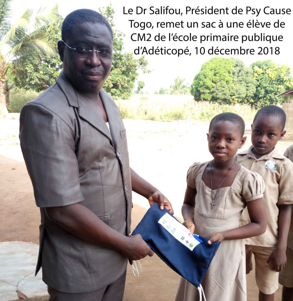 Le Président de Psy Cause Togo, le Dr Saliou Salifou, nous écrit le 16 janvier, photos à l’appui : « Le 10 décembre dernier, Psy Cause Togo a décidé de faire une action sociale comme suite du congrès. Il s’est agi de faire don du reste des sacs et bics du congrès aux élèves qui ne disposaient pas de sac d’école. Les classes de CM2 de l’Ecole Primaire Publique d’Adéticopé Groupe C ont été privilégiées afin de les encourager à plus d’effort pour l’examen de fin d’année scolaire CEPD (Certificat d’Etude du Premier Degré). Au Total une cinquantaine de sacs et une centaine de bics ont été distribués. Les enseignants et les élèves ont été très ravis de cette action. »